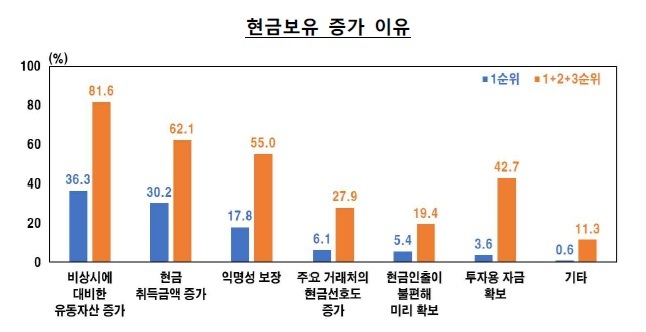 반면 현금 보유 규모는 개인과 기업 모두 크게 늘었다. 개인의 1인당 평균 현금 보유액은 64만4000원으로 2021년보다 47.7% 증가했다. 이 중 거래용 현금은 10만3000원, 예비용 현금은 54만1000원으로, 특히 예비용 현금이 50% 이상 늘었다. 기업의 평균 현금 보유액도 977만8000원으로 2021년 대비 두 배 이상 증가했다. 기업들은 현금 보유 확대 이유로 '경영환경 불확실성에 대비한 유동성 확보'를 가장 많이 꼽았다.