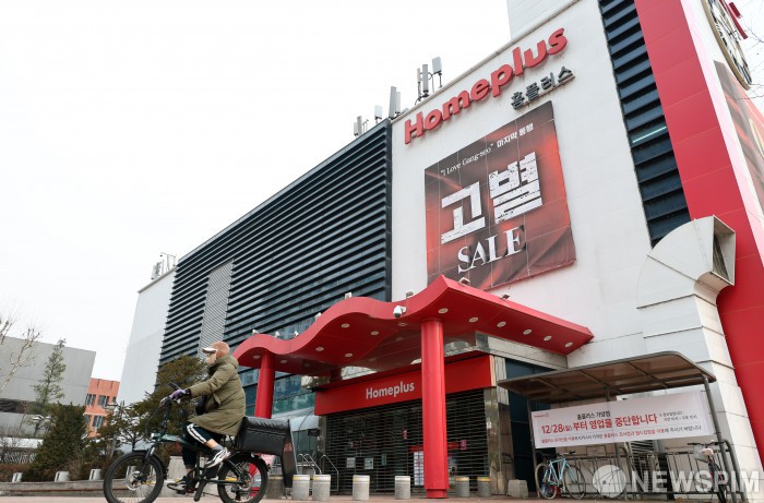 [서울=뉴스핌] 최지환 기자 = 기업회생에 난항을 겪고 있는 홈플러스가 28일부터 적자 규모가 큰 가양, 일산, 장림, 원천, 울산북구 등 5개 지점의 운영을 중단했다. 사진은 28일 영업을 중단한 홈플러스 가양점의 모습. 2025.12.28 choipix16@newspim.com