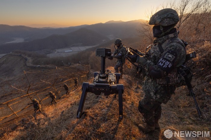 [연천=뉴스핌] 류기찬 기자 = 철책선 넘어 밝아오는 태양 아래, 군은 새로운 전투 시대를 맞이하고 있다. 지난 22일 오전 경기 연천군 5사단 열쇠부대 군 장병들이 지난해부터 대테러작전·수색·정찰 등 다양한 군사 임무에서 시범운용중인 다족 보행 로봇과 함께 철책 경계 근무에 나섰다. 다족 보행 로봇은 육군이 추진 중인 차세대 전투체계 '아미 타이거' 전투실험의 하나로 또 다른 전투원 역할을 수행하기 위해 투입됐다. 2025.12.29 ryuchan0925@newspim.com