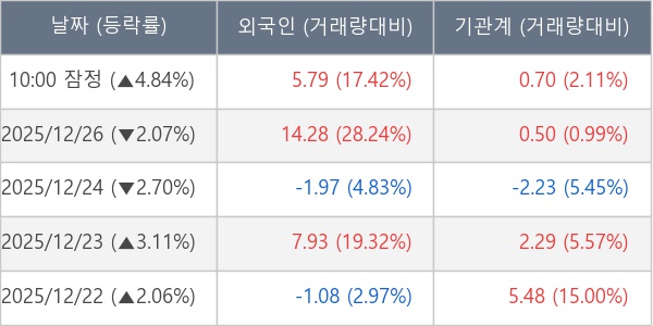 [서울=뉴스핌] 로보뉴스 = 29일 10시 15분 현재 현대로템(064350)은 외국인과 기관이 각각 5.79 만 주, 0.70 만 주 순매수(잠정) 하면서 전일 대비 4.84% (현재가 188,500원) 상승하고 있다.