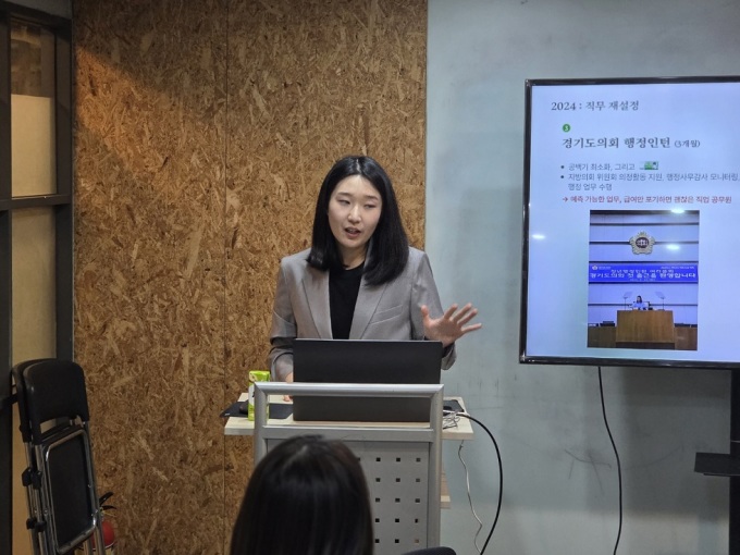 이날 강연은 경기도기숙사 입사생 김세정(25세) 청년멘토가 '3번의 인턴 경험을 통해 회계담당자가 된 이야기'를 주제로 진행했다.