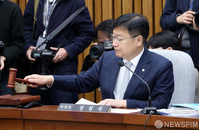 [서울=뉴스핌] 정일구 기자 = 29일 오전 서울 여의도 국회에서 열린 김호철 감사원장 후보자 인사청문회에서 정점식 인사청문특별위원장이 의사봉을 두드리고 있다. 2025.12.29 mironj19@newspim.com