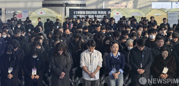 [서울=뉴스핌] 사진공동취재단 = 12.29 제주항공 여객기 참사 1주기인 29일 오전 전남 무안군 무안국제공항에서 열린 '12.29 제주항공 여객기 참사 1주기 추모식'에서 사고 발생 시간인 오전 9시 3분 사이렌이 울리자 참석자들이 희생자들을 기리며 묵념하고 있다. 2025.12.29 photo@newspim.com