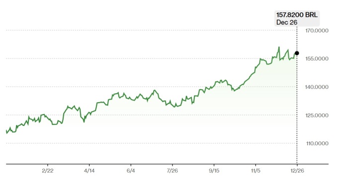 브라질 대표 주가지수 이보베스파(IBOVESPA)는 12월 말 기준 약 16만 포인트 안팎에서 움직이며, 연초 대비 30% 이상 상승한 강세장을 기록한 상태다.