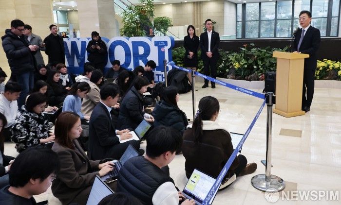 [서울=뉴스핌] 양윤모 기자 = 이강행 우리금융지주 임원후보추천위원장이 29일 오후 서울 중구 우리은행 본점에서 차기 우리금융 회장으로 임종룡 회장 선임을 발표하고 있다. 2025.12.29 yym58@newspim.com