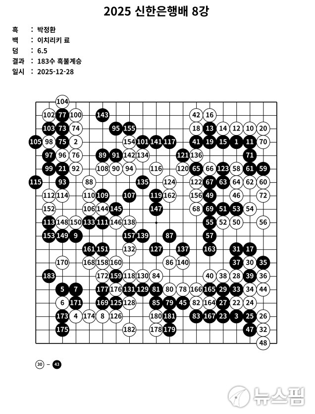 이날 팽팽한 백중세을 이루던 국면은 좌변 패를 둘러싼 공방에서 박정환 9단(흑)이 포인트를 따내며 우위를 점했다. 이후 당이페이 9단(백)의 버티기에도 박정환 9단이 흔들리지 않고 두텁게 국면을 마무리했다.