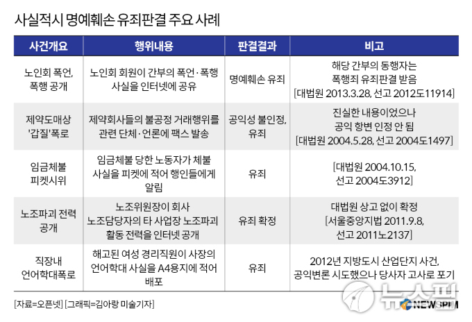 배드파더스 사건뿐만 아니라 사실적시 명예훼손죄로 처벌받은 사례는 쉽게 찾아볼 수 있다. 결국 현행법상 우리나라에선 사실에 기반해 타인을 비판하더라도 '공익'을 위한 것이라는 엄격한 위법성조각사유를 입증하지 못하면 형사처벌을 받을 수 있는 상황인 것이다.