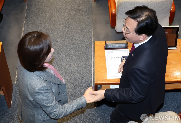 [서울=뉴스핌] 정일구 기자 = 송언석 국민의힘 원내대표와 나경원 의원이 30일 오후 서울 여의도 국회에서 열린 본회의에서 대화하고 있다. 2025.12.30 mironj19@newspim.com