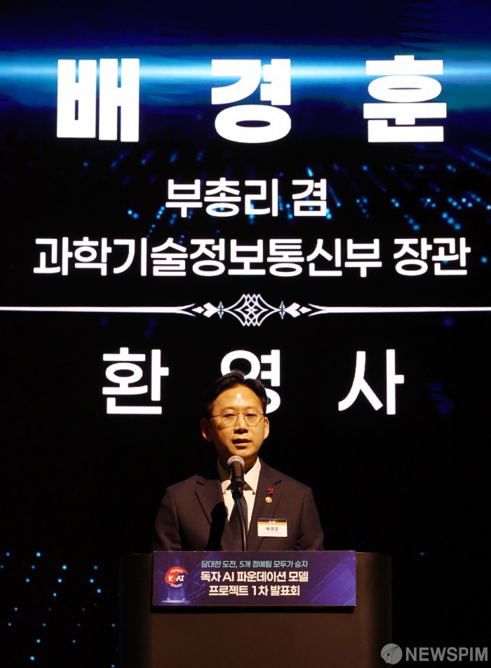 [서울=뉴스핌] 최지환 기자 = 배경훈 부총리 겸 과학기술정보통신부 장관이 30일 오후 서울 강남구 코엑스에서 열린 '독자 AI 파운데이션 모델' 프로젝트 1차 발표회에서 환영사를 하고 있다. 2025.12.30 choipix16@newspim.com
