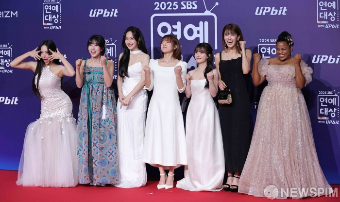 [서울=뉴스핌] 윤창빈 기자 =예능 골 때리는 그녀들(왼쪽부터 한초희, 정예원, 소유미, 경서, 벤, 마시마 유, 엘로디) 출연진이 30일 서울 마포구 SBS프리즘타워에서 열린 2025 SBS 연예대상 포토월에서 포즈를 취하고 있다. 2025.12.30 pangbin@newspim.com