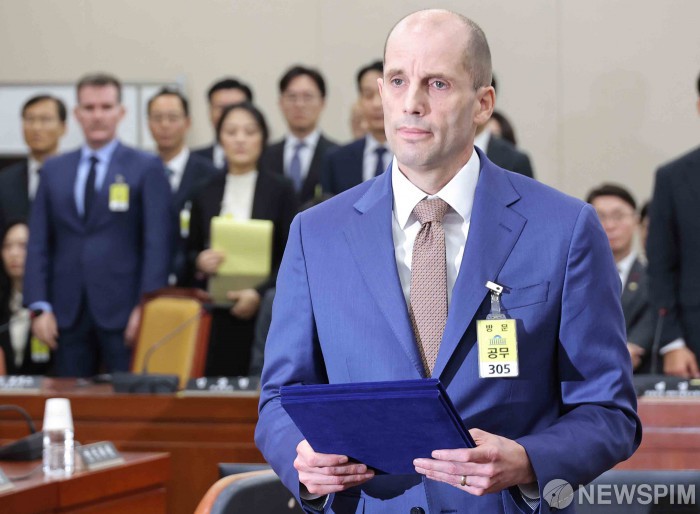[서울=뉴스핌] 윤창빈 기자 = 해롤드 로저스 쿠팡 임시대표가 31일 서울 여의도 국회 과학기술정보방송통신위원회 전체회의에서 열린 쿠팡 침해사고 및 개인정보 유출, 불공정 거래, 노동환경 실태 파악과 재발방지 대책 마련을 위한 청문회에서 선서문을 들고 이동하고 있다. 2025.12.31 pangbin@newspim.com
