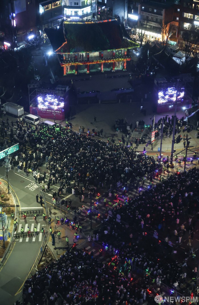 [서울=뉴스핌] 정일구 기자 = 병오년(丙午年) 새해 첫날인 1일 오전 서울 종로구 보신각에서 열린 2025 제야의 종 타종행사에서 시민들이 타종을 보며 2026년 새해를 맞이하고 있다. 2026.01.01 mironj19@newspim.com