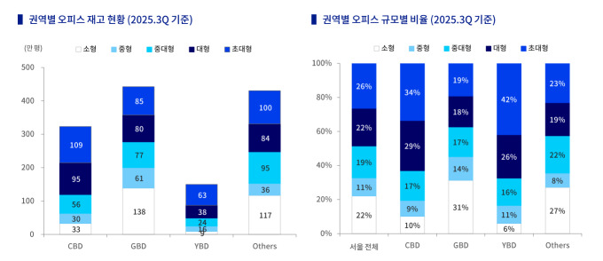 (좌)2025년 3분기 권역별 오피스 재고 현황 (우)2025년 3분기 권역별 오피스 규모별 비율 [자료=젠스타메이트]