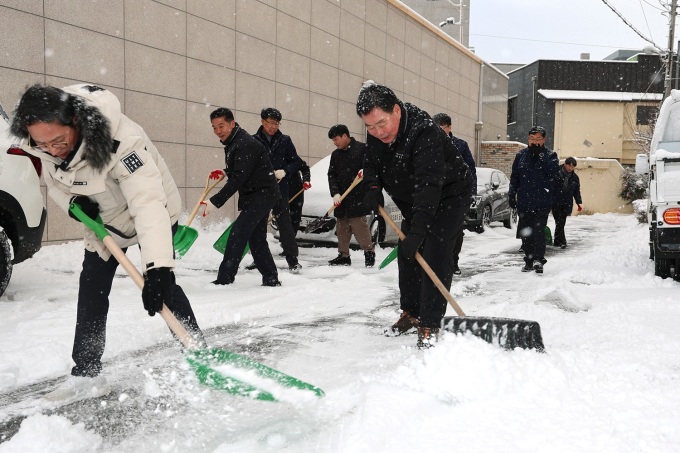 2일 새벽에는 김산 군수를 비롯한 김병중 부군수와 공직자들이 무안군청 일대와 무안읍 중앙로 등 주요 시가지, 마을 골목길에서 직접 제설에 나서는 등 주민 불편 해소에 나섰다.