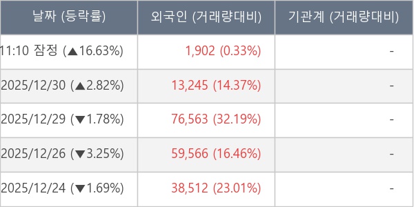 [장중수급포착] 기가레인, 외국인 5일 연속 순매수행진... 주가 +16.63%