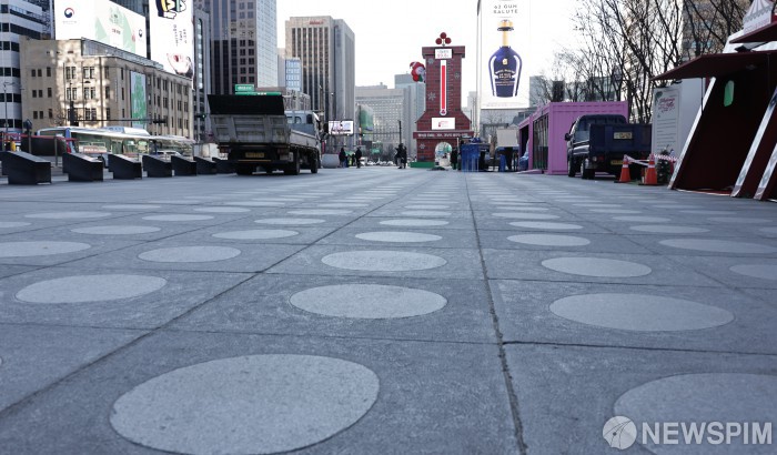 [서울=뉴스핌] 양윤모 기자 = 2일 서울의 아침 기온이 영하 11.4도까지 떨어지고 체감온도가 영하 17도를 나타내며 새해 한파가 절정에 달하고 있는 가운데, 서울 종로구 광화문광장은 취위로 인적이 끊어져 있다. 2026.01.02 yym58@newspim.com