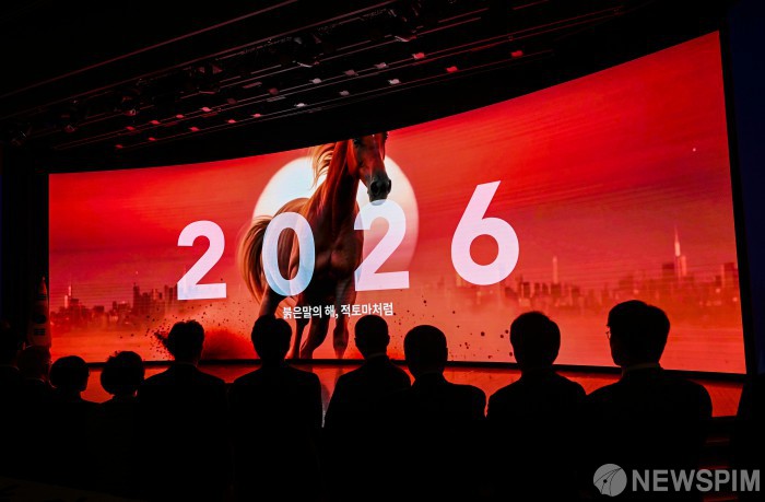 [서울=뉴스핌] 사진공동취재단 = 김민석 국무총리를 비롯한 경제계 인사들이 2일 오후 서울 중구 대한상공회의소 국제회의장에서 ‘2026 경제계 신년인사회’를 하고 있다. 2026.01.02 photo@newspim.com
