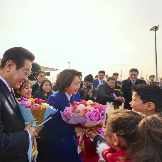 중국 국빈 방문을 위해 4일 오후 베이징 서우두공항에 도착한 이재명 대통령이 공항에서 남녀 화동으로부터 방문 환영 꽃다발을 받고 있다. 이 대통령과 김혜경 여사는 직접 화동들과 기념사진을 찍었다. [사진=KTV]