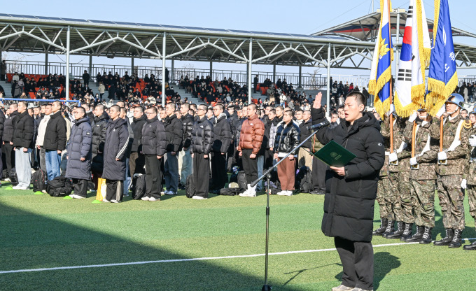 5일 오후 충남 논산 육군훈련소 입영심사대에서 열린 새해 첫 입영식에서 입영장정들이 선서하고 있다. [사진=육군 제공] 2026.01.05 gomsi@newspim.com