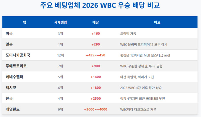 오타니 쇼헤이(LA 다저스)가 이끄는 일본은 +280~+300 배당으로 미국과 양강 구도를 형성한다. 도미니카공화국은 세계랭킹 12위이지만 우승 배당은 +425~+450에 불과하다. 푸에르토리코(+900)와 베네수엘라(+1400), 멕시코(+1800)가 뒤를 잇는다.