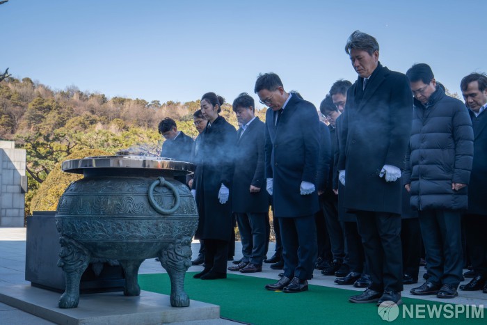 [서울=뉴스핌] 한화에어로스페이스와 한화시스템, 한화오션 임직원들이 지난 5일 서울 동작구 국립서울현충원에서 현충탑에 참배하고 있다. [사진=한화에어로스페이스] 2026.01.06 photo@newspim.com