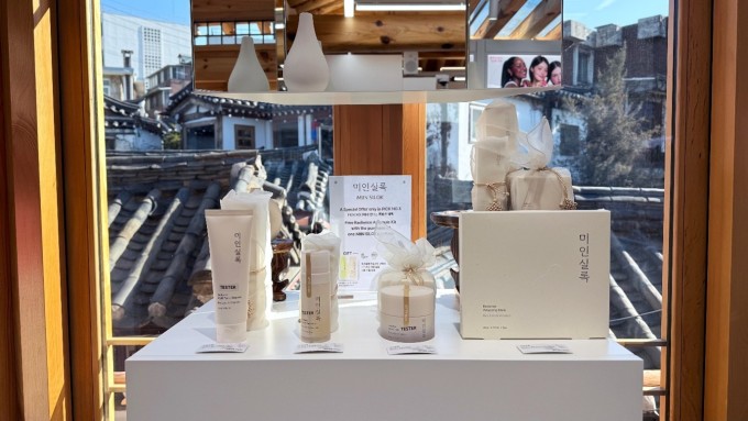 막걸리 술지게미를 활용한 국내 최초의 뷰티 브랜드 '미인실록'의 제품들이 최근 서울 삼청동 북촌에 오픈한 뷰티 큐레이션 매장 '픽넘버쓰리' 1호점에서 전시되고 있다. [사진=HLB생활건강]
