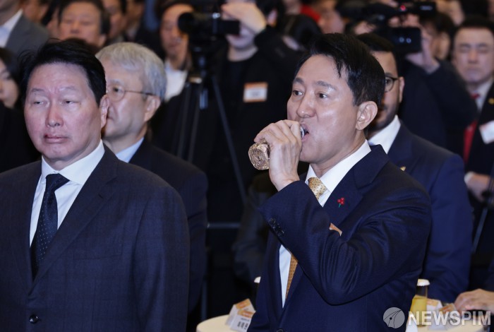 [서울=뉴스핌] 양윤모 기자 = 오세훈 서울시장이 7일 오전 서울 중구 대한상공회의소 국제회의장에서 개최된 '2026년 서울시 신년인사회'에 참석해 신년사회에 참석해 물을 마시고 있다.행사에는 오 서울시장, 최태원 서울상의 회장, 최호정 서울시의회 의장, 정근식 서울시교육감, 서영교 더불어민주당 국회의원, 나경원 국민의힘 국회의원,구청장 등 800여명이 참석했다. 2026.01.07 yym58@newspim.com