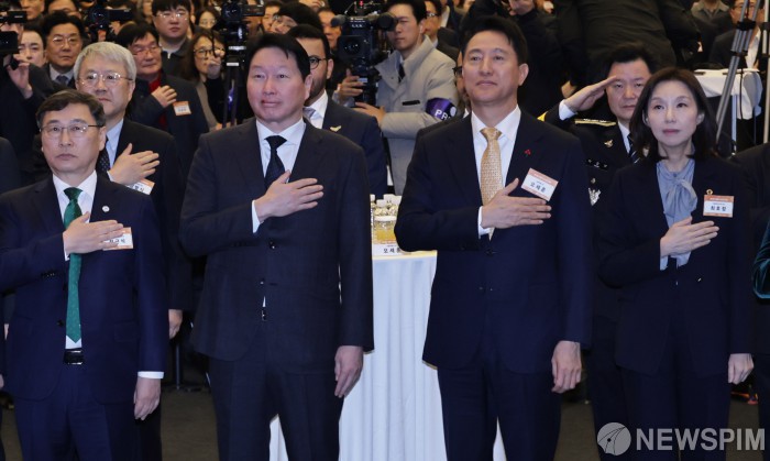 [서울=뉴스핌] 양윤모 기자 = 오세훈 서울시장이 7일 오전 서울 중구 대한상공회의소 국제회의장에서 개최된 '2026년 서울시 신년인사회'에 참석해 국민의례를 하고 있다.행사에는 오 서울시장, 최태원 서울상의 회장, 최호정 서울시의회 의장, 정근식 서울시교육감, 서영교 더불어민주당 국회의원, 나경원 국민의힘 국회의원,구청장 등 800여명이 참석했다. 2026.01.07 yym58@newspim.com