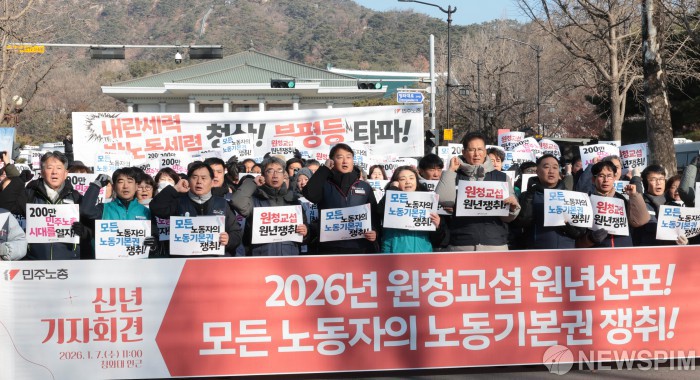 [서울=뉴스핌] 이길동 기자 = 민주노총 조합원들이 7일 서울 종로구 청와대 앞에서 열린 '원청교섭 원년 선포! 모든 노동자의 노동기본권 쟁취! 2026년 민주노총 신년 기자회견'에서 구호를 외치고 있다. 2026.01.07 gdlee@newspim.com