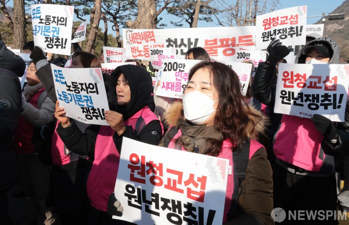 [서울=뉴스핌] 이길동 기자 = 민주노총 조합원들이 7일 서울 종로구 청와대 앞에서 열린 '원청교섭 원년 선포! 모든 노동자의 노동기본권 쟁취! 2026년 민주노총 신년 기자회견'에서 구호를 외치고 있다. 2026.01.07 gdlee@newspim.com