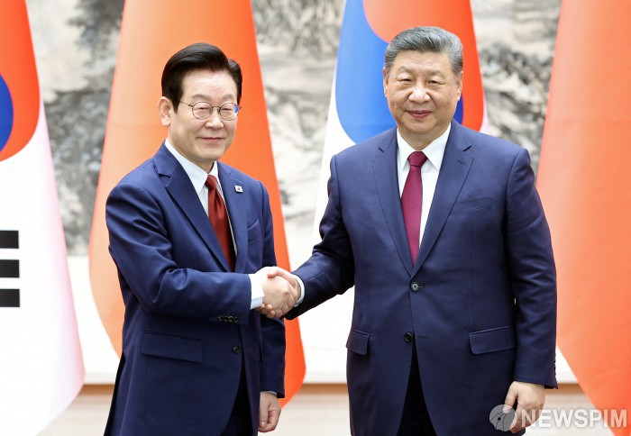 이재명 대통령과 시진핑 중국 국가주석이 5일 중국 베이징 인민대회당에서 악수를 하고 있다. [사진=로이터 뉴스핌]