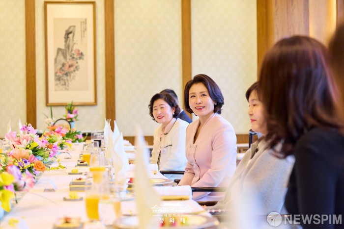 [서울=뉴스핌] 김혜경 여사가 지난 6일 중국 베이징 댜오위타이(조어대·釣魚臺)에서 열린 재중 한인 여성 활동가 초청 오찬간담회에서 참석자들과 대화를 나누고 있다. [사진=청와대] 2026.01.07 photo@newspim.com