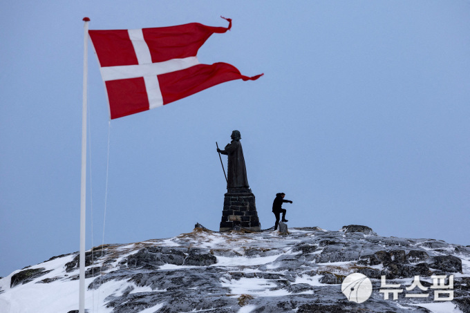 [누크=뉴스핌] 장일현 특파원 = 작년 3월 9일(현지 시간) 덴마크 자치령 그린란드 수도 누크에서 한 남성이 총선을 이틀 앞두고 덴마크 식민 지배의 상징으로 여겨지는 한스 에게데 동상 옆을 지나고 있다. 그 뒤로 덴마크 국기가 펄럭이고 있다. 2026.01.07. hjang67@newspim.com