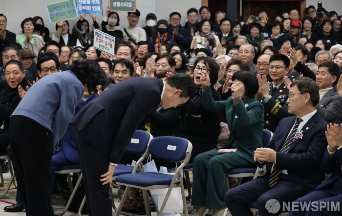 [서울=뉴스핌] 양윤모 기자 = 정원오 성동구청장이 8일 오후 서울 성동구 행당동 성동구청 대강당에서 개최된 '2026 성동구 신년인사회'에 참석해 고개숙여 인사하고 있다. 더불어민주당 서울시장 후보군으로 거론되는 정원오 성동구청장은 최근 서울의 주택 공급 부족 현상은 오세훈 서울시장으로부터 비롯됐다고 직격했다. 2026.01.08 yym58@newspim.com