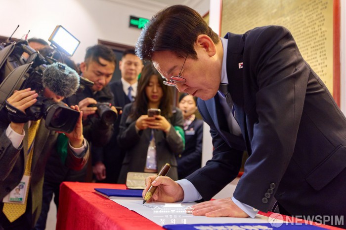 [서울=뉴스핌] 이재명 대통령이 지난 7일 중국 상하이 대한민국 임시정부 청사에서 열린 청사 건립 100주년 기념식을 마친 뒤 방명록을 작성하고 있다. [사진=청와대] 2026.01.08 photo@newspim.com