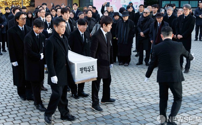 [서울=뉴스핌] 윤창빈 기자 = 배우 고(故) 안성기의 영결식이 엄수된 9일 서울 중구 명동성당에서 배우 설경구·박철민·유지태·박해일·조우진·주지훈이 고인을 운구하고 있다. 2026.01.09 pangbin@newspim.com