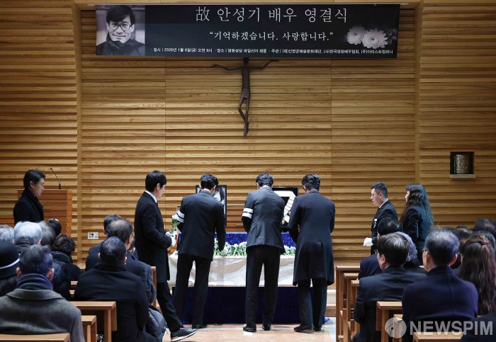 [서울=뉴스핌] 윤창빈 기자 = 9일 서울 중구 명동성당 파밀리아 채플홀에서 엄수된 배우 고(故) 안성기 영결식에서 배우 설경구, 이정재, 정우성 등 동료 배우들이 헌화하고 있다. 2026.01.09 pangbin@newspim.com