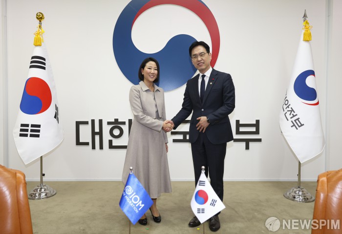 [서울=뉴스핌] 김민재 행정안전부 차관이 9일 오후 서울 종로구 정부서울청사에서 이성아 국제이주기구(IOM) 사무차장과 면담에 앞서 기념촬영을 하고 있다.[사진=행정안전부] 2026.01.09 photo@newspim.com