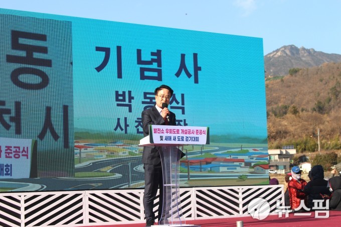 [사천=뉴스핌] 최민두 기자 = 박동식 사천시장이 10일 오후 삼천포발전소 우회도로 준공식에 참석해 기념사를 하고 있다. 2026.01.10