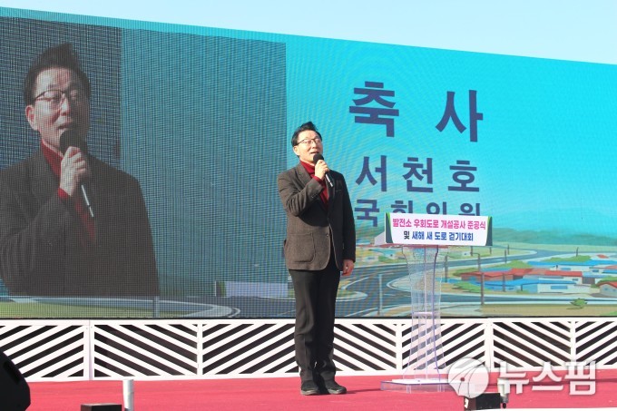 [사천=뉴스핌] 최민두 기자 = 서천호 국회의원이 10일 오후 삼천포발전소 우회도로 준공식에 참석해 축사를 하고 있다. 2026.01.10