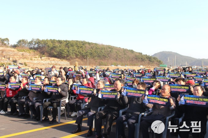 [사천=뉴스핌] 최민두 기자 = 10일 오후 삼천포발전소 우회도로 준공식에 참석한 참석자들이 우주항공복합도시 건설 특별법 통과를 촉구하고 있다. 2026.01.10