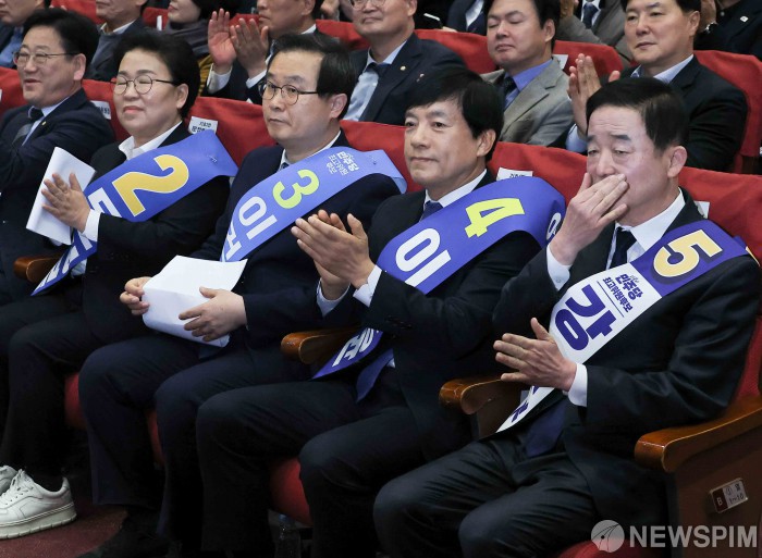 [서울=뉴스핌] 윤창빈 기자 = 문정복(왼쪽부터), 이건태, 이성윤, 강득구 더불어민주당 최고위원 후보가 11일 서울 여의도 국회 의원회관에서 열린 최고위원 보궐선거 후보자 합동연설회에서 박수를 치고 있다. 2026.01.11 pangbin@newspim.com