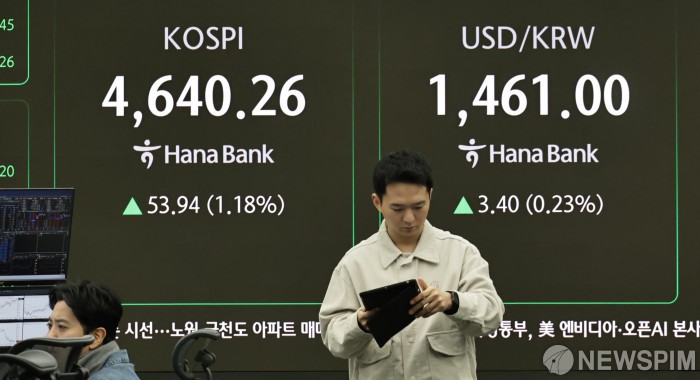 [서울=뉴스핌] 양윤모 기자 = 12일 오전 코스피가 전장 종가보다 53.94포인트(1.18%) 상승하며 4640.26으로, 코스닥은 0.98 포인트(0.10%) 하락한 946.94로 장을 시작한 가운데, 서울 중구 하나은행 딜링룸에서 직원들이 업무를 보고 있다. 서울외환시장에서 달러/원 환율은 전장 대비 3.40원 상승한 1461.00원에 주간거래를 시작했다. 2026.01.12 yym58@newspim.com