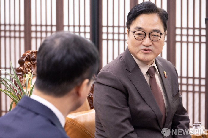 [서울=뉴스핌] 정일구 기자 = 우원식 국회의장(오른쪽)이 12일 오전 서울 여의도 국회 의장실에서 한병도 더불어민주당 신임 원내대표를 접견하고 있다. 2026.01.12 mironj19@newspim.com