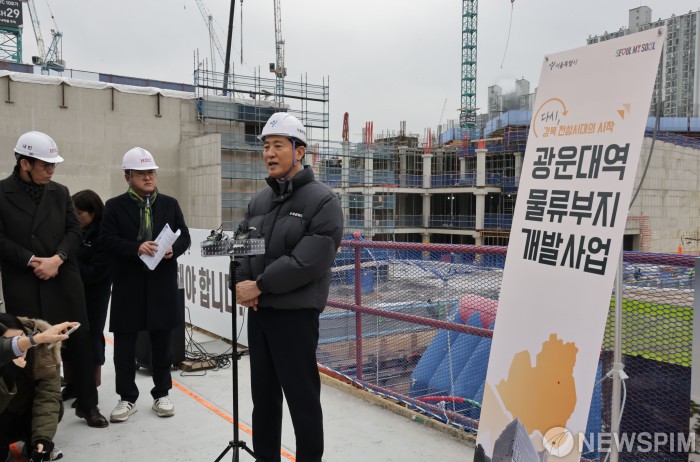 [서울=뉴스핌] 양윤모 기자 = 오세훈 서울시장이 12일 오후 노원구 월계동 광운대역 물류부지 공사현장을 찾아 HDC현대산업개발이 시공중인 'SEOUL ONE' 현장을 시찰후 '다시 강북시대' 메세지를 전달하고 있다. 40여년 간 물류시설, 시멘트 저장고가 있던 광운대역 일대 15만 6,581㎡에 상업·주거·업무시설, 생활SOC 등을 조성하는 ‘광운대역 물류부지 개발 사업’은 복합용지 주택 건설을 시작으로 오는 '28년 준공을 목표로 추진된다. 2026.01.12 yym58@newspim.com