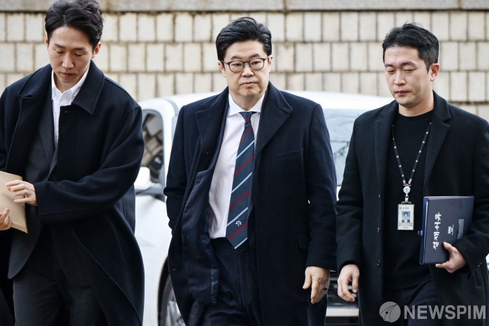 [서울=뉴스핌] 정일구 기자 = '홈플러스 사태'와 관련 사기 혐의를 받는 김병주 MBK파트너스 회장이 13일 오전 서울 서초구 서울중앙지방법원에서 열린 구속 전 피의자 심문(영장실질심사)에 출석하고 있다. 2026.01.13 mironj19@newspim.com