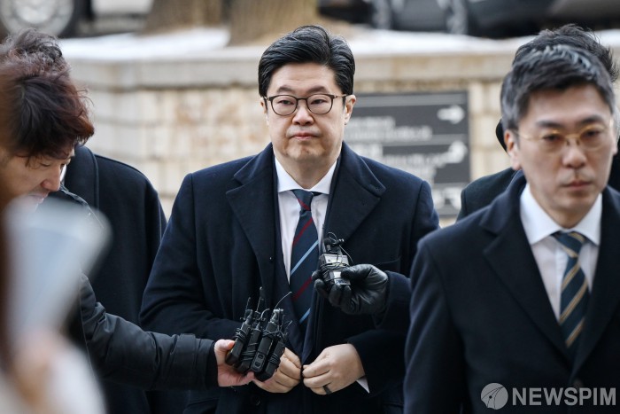 [서울=뉴스핌] 정일구 기자 = '홈플러스 사태'와 관련 사기 혐의를 받는 김병주 MBK파트너스 회장이 13일 오전 서울 서초구 서울중앙지방법원에서 열린 구속 전 피의자 심문(영장실질심사)에 출석하고 있다. 2026.01.13 mironj19@newspim.com