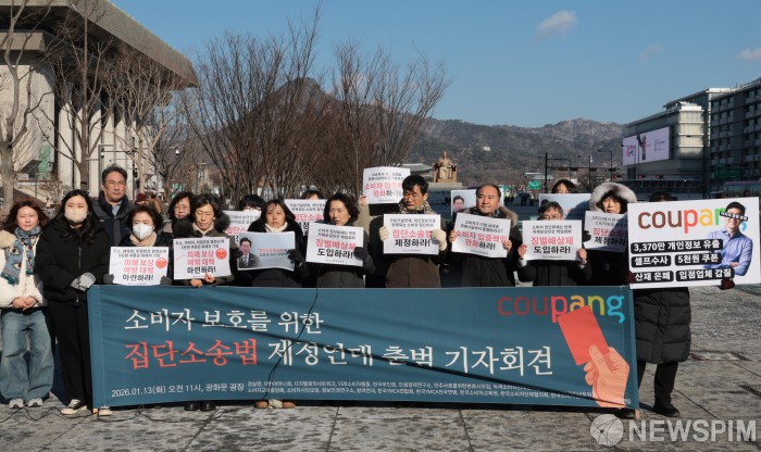 [서울=뉴스핌] 이길동 기자 = 한국소비자단체협의회등 시민사회단체 관계자들이 13일 서울 종로구 광화문광장 이순신 동상앞에서 '소비자 보호를 위한 집단소송법 제정연대 출범 기자회견'을 하고 있다. 2026.01.13 gdlee@newspim.com