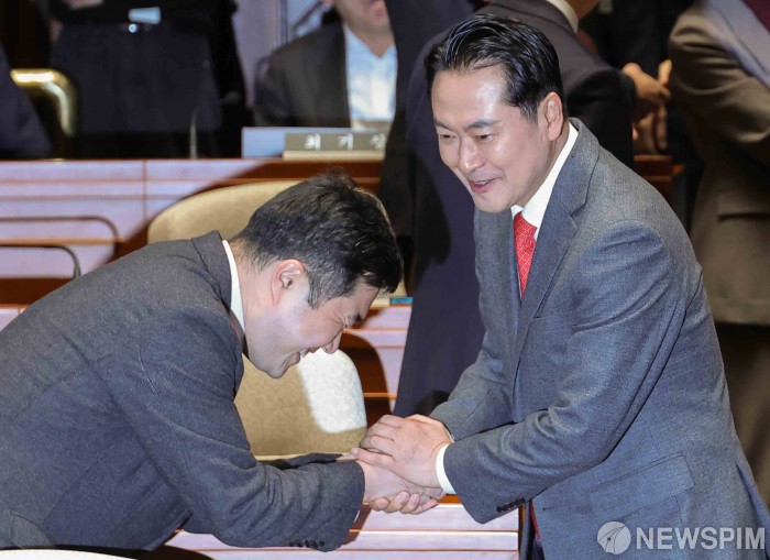 [서울=뉴스핌] 윤창빈 기자 = 장동혁 국민의힘 대표가 13일 서울 여의도 국회에서 열린 국회의원-당협위원장 연석회의 및 의원총회에서 인사를 나누고 있다. 2026.01.13 pangbin@newspim.com