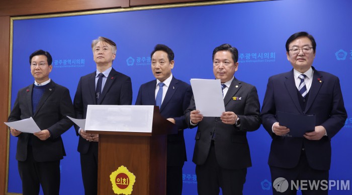 [광주=뉴스핌] 박진형 기자 = 광주 구청장협의회가 13일 광주시의회 브리핑룸에서 광주·전남 행정통합 관련해 입장 발표 기자회견을 하고 있다. (왼쪽부터) 박병규 광산구청장, 김이강 서구청장, 임택 동구청장, 김병내 남구청장, 문인 북구청장. 2026.01.13 bless4ya@newspim.com
